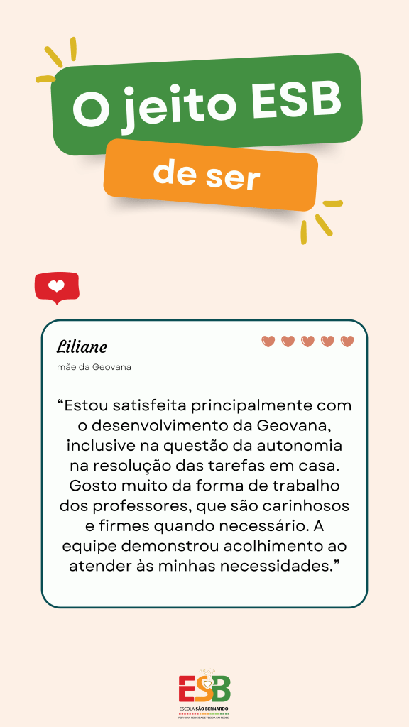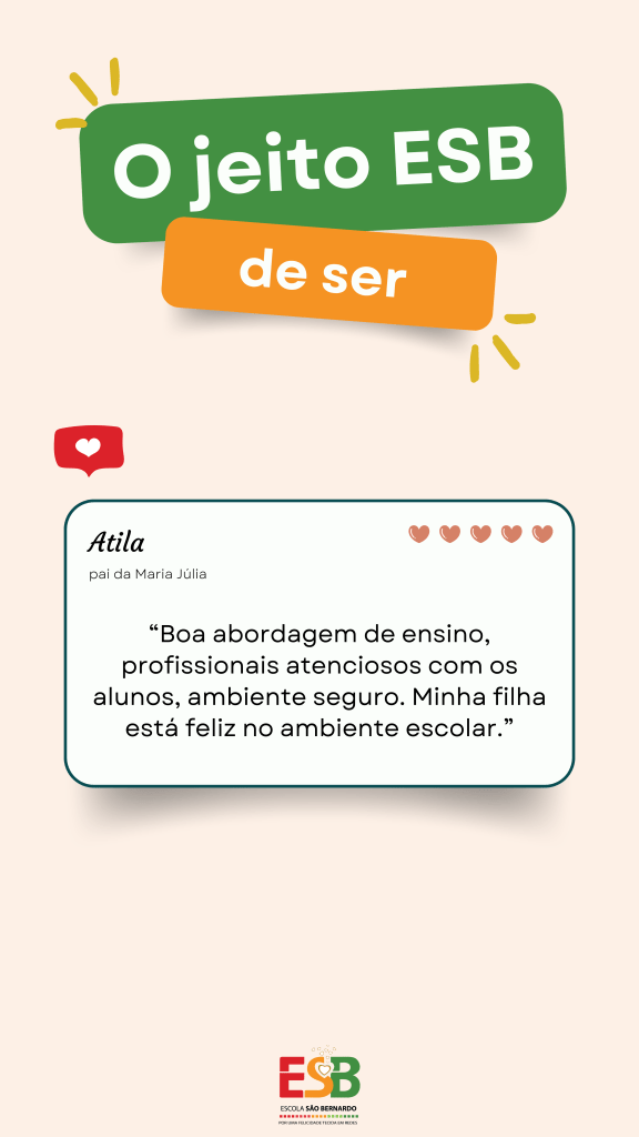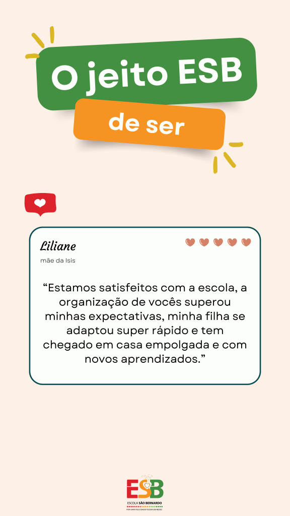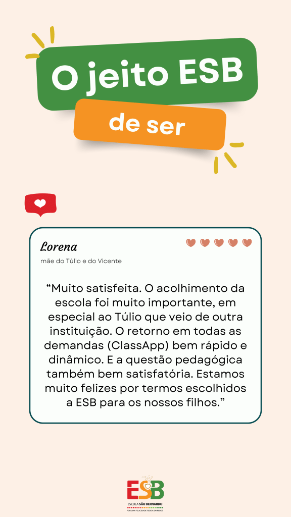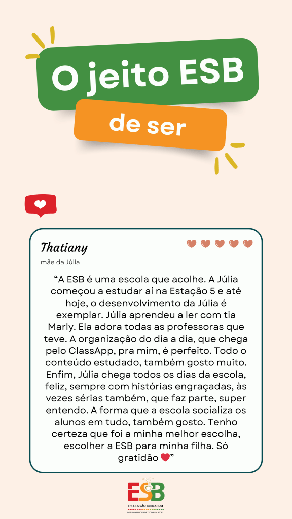 A ESB é uma Escola sociointeracionista, de abordagem histórico-cultural, que há 40 anos aprende com a trajetória percorrida e se projeta em um futuro que exigirá o aprender, o comunicar e colaborar contínuos, o protagonizar por meio de práticas criativas e disruptivas, entendidas como o pensamento que rompe com o padrão de repetição, que rastreia novos paradigmas, sempre atento a outras maneiras de associação, composição e reorganização dos fatos e dos saberes.