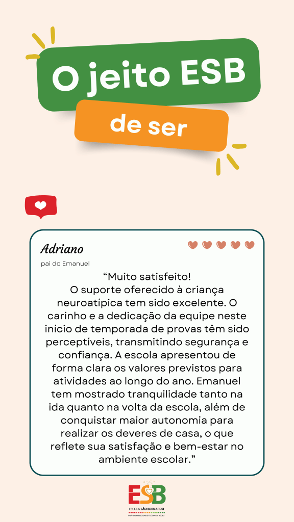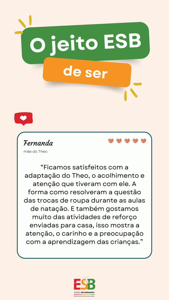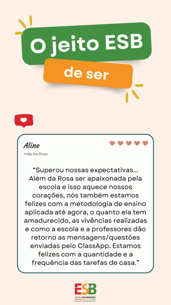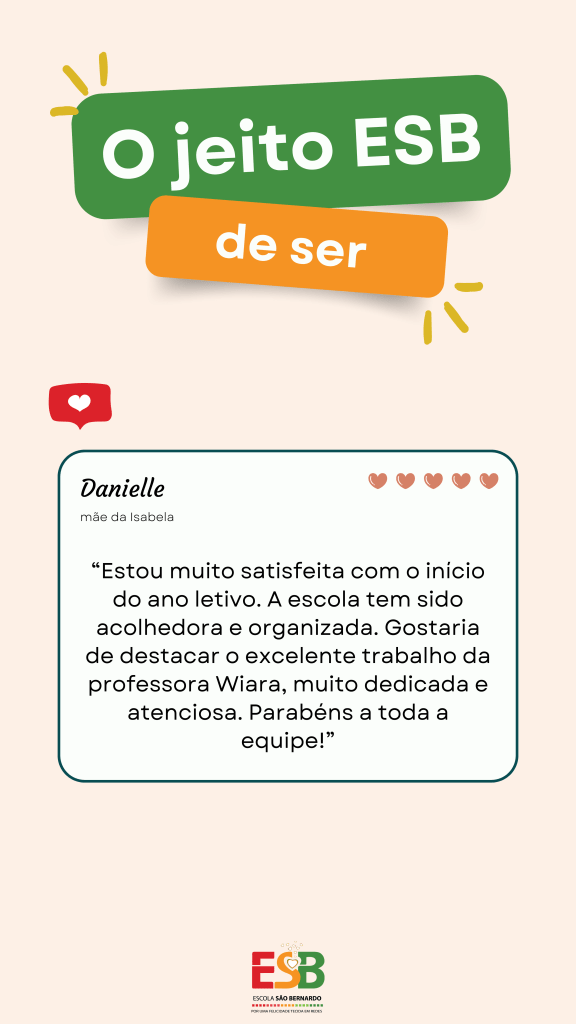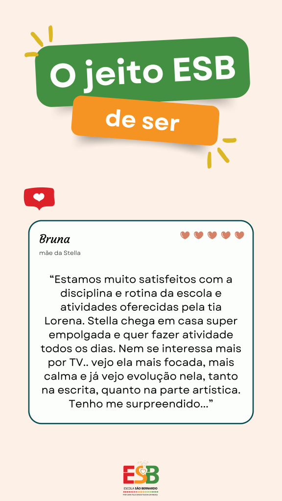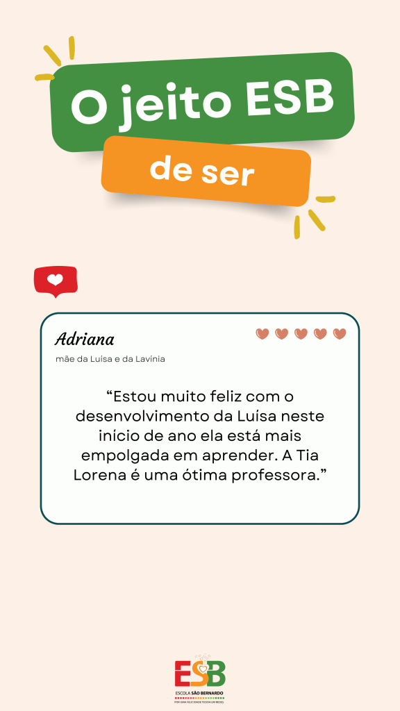 A ESB é uma Escola sociointeracionista, de abordagem histórico-cultural, que há 40 anos aprende com a trajetória percorrida e se projeta em um futuro que exigirá o aprender, o comunicar e colaborar contínuos, o protagonizar por meio de práticas criativas e disruptivas, entendidas como o pensamento que rompe com o padrão de repetição, que rastreia novos paradigmas, sempre atento a outras maneiras de associação, composição e reorganização dos fatos e dos saberes.