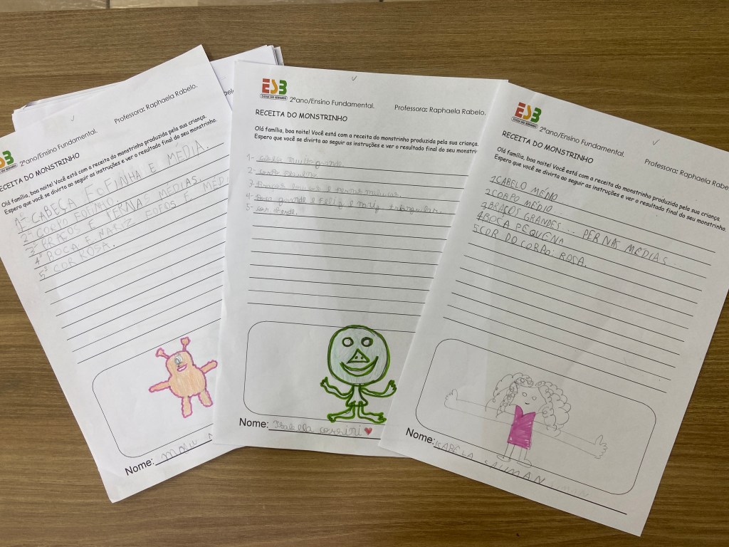 A partir dessa conversa, criamos uma dinâmica para a reunião de pais. Cada criança pensou em um monstrinho e escreveu a receita dele para que os seus pais o desenhassem na reunião. Será que os pais conseguiram colocar no papel exatamente o monstro que o filho idealizou? No dia seguinte, mostramos os desenhos às crianças, que estavam empolgadas para ver o resultado. A maioria disse que os pais não “fizeram o desenho certo” e, mais uma vez, chegamos à conclusão de que nem sempre o que pensamos ou idealizamos vai se concretizar, na prática, da forma como queremos. Outras crianças analisaram a receita e perceberam que faltou informação para que o desenho se aproximasse do que eles tinham em mente, demonstrando a importância da autoavaliação.