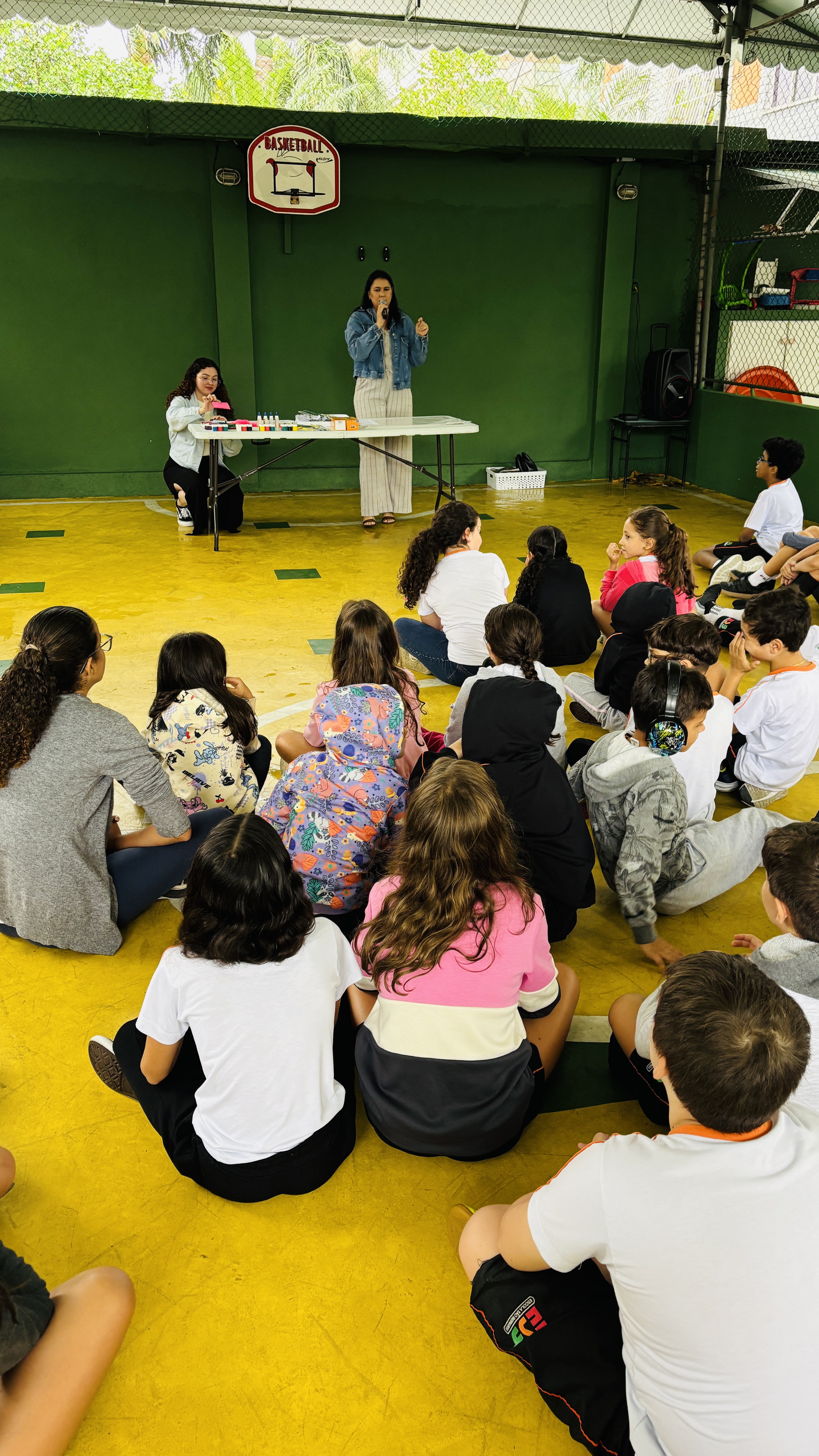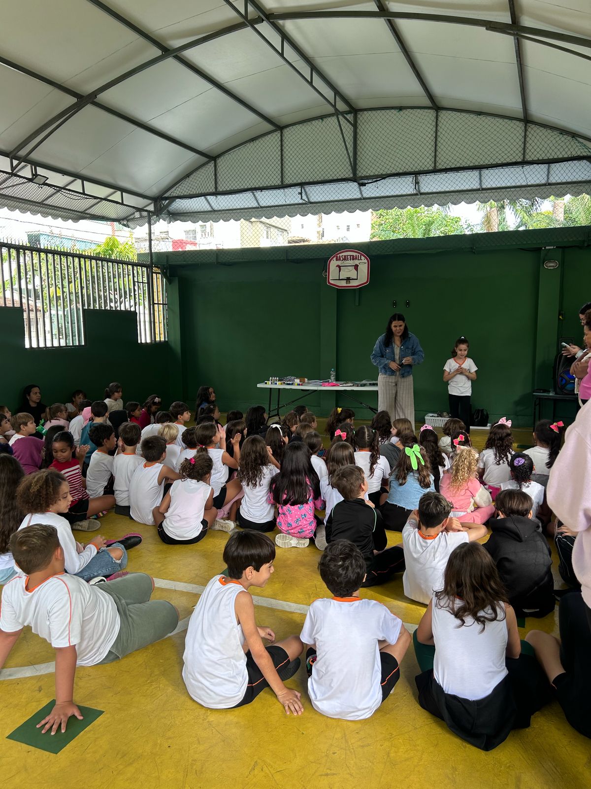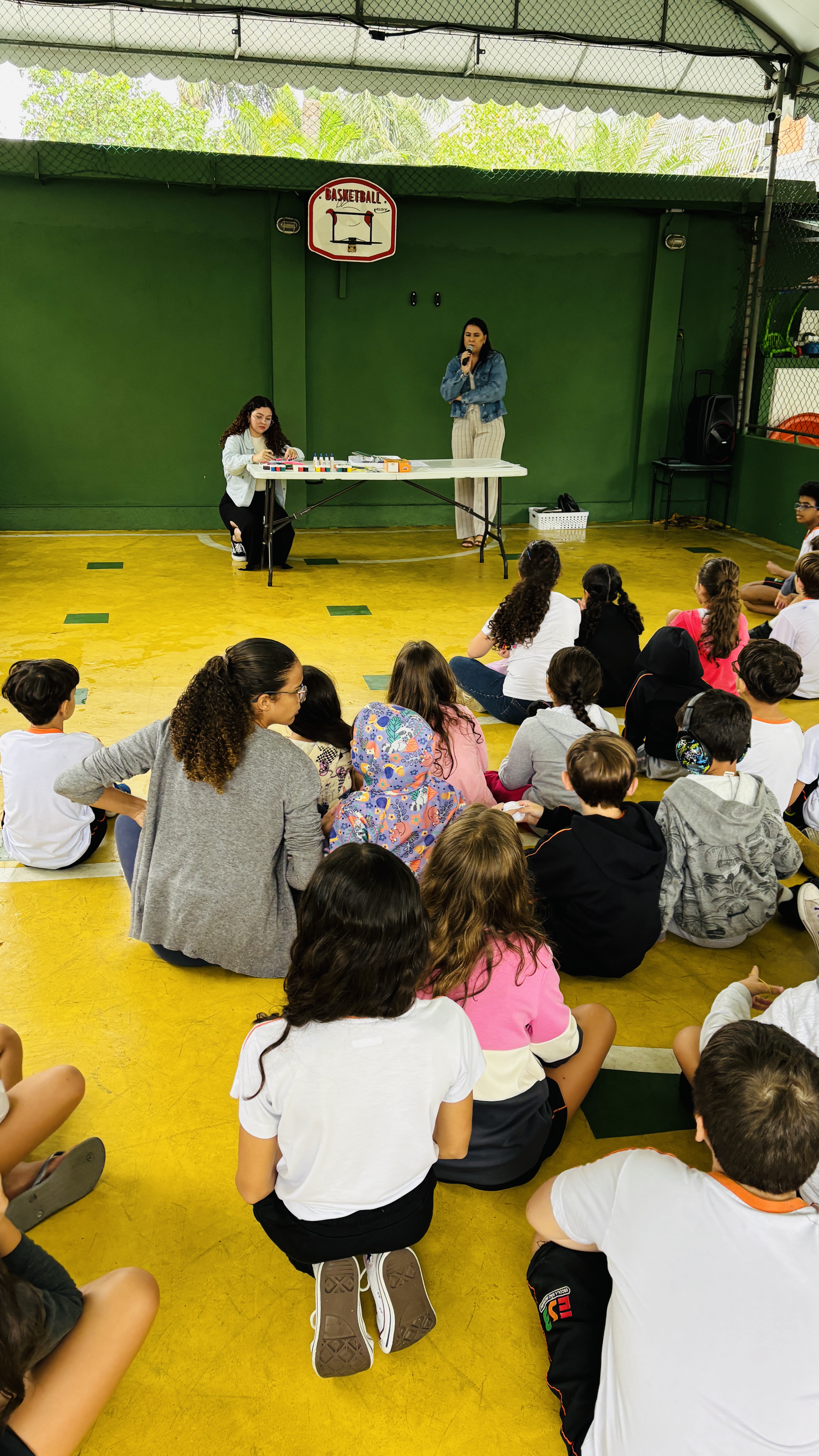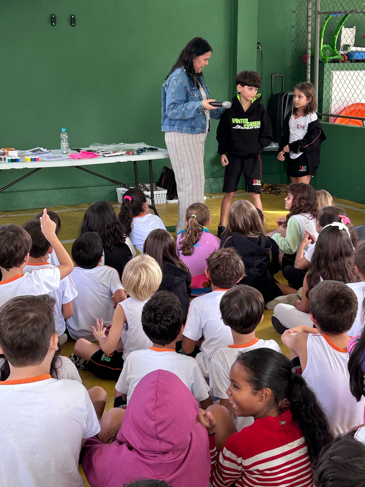 Durante o encontro, Bruna conversou com as crianças sobre o que é bullying, quais são suas consequências e, principalmente, como cada um pode contribuir para um ambiente mais respeitoso e seguro. Os alunos participaram com entusiasmo: compartilharam o que sabiam sobre o tema, deram exemplos de atitudes de apoio aos colegas e ouviram com atenção as orientações da convidada.
