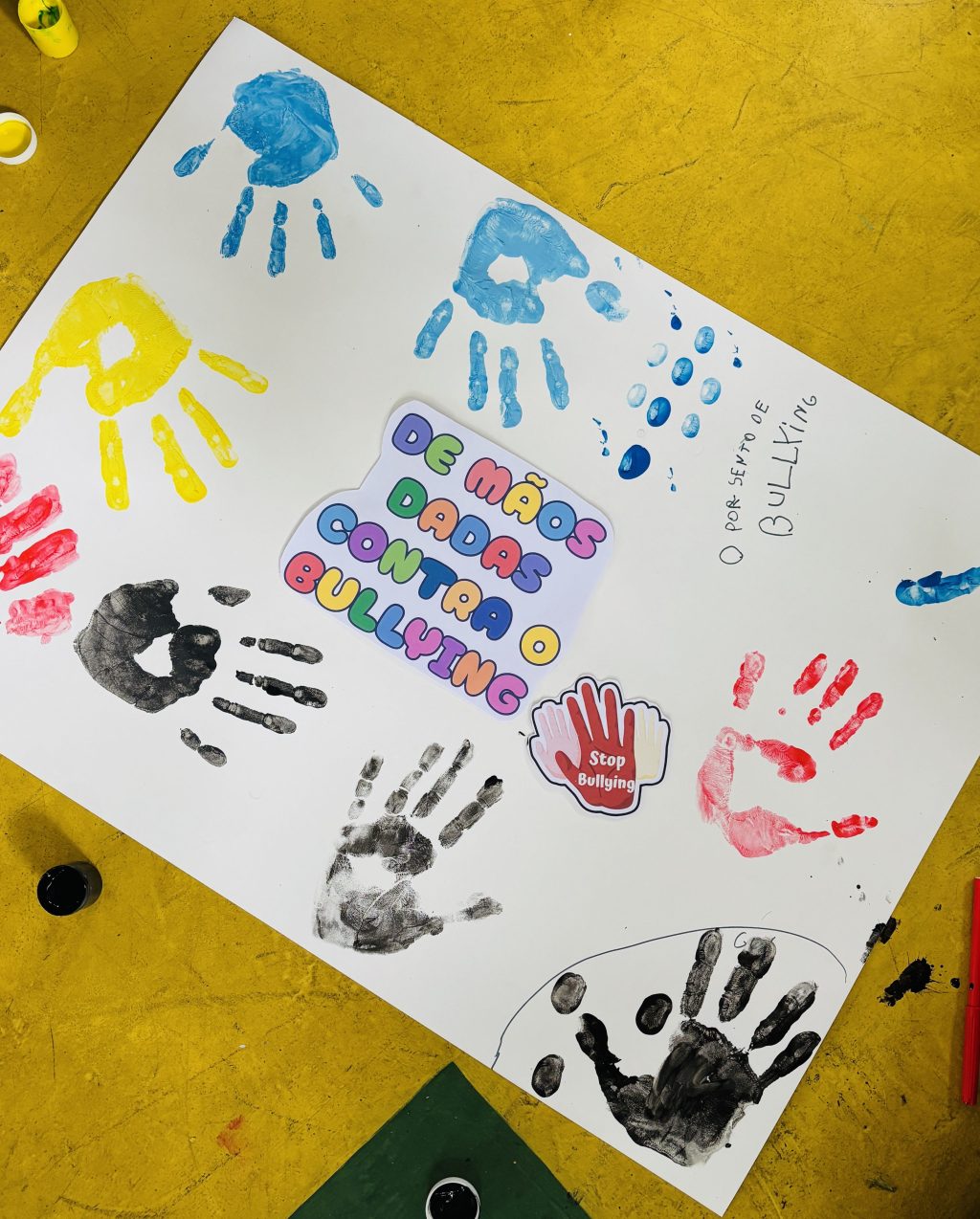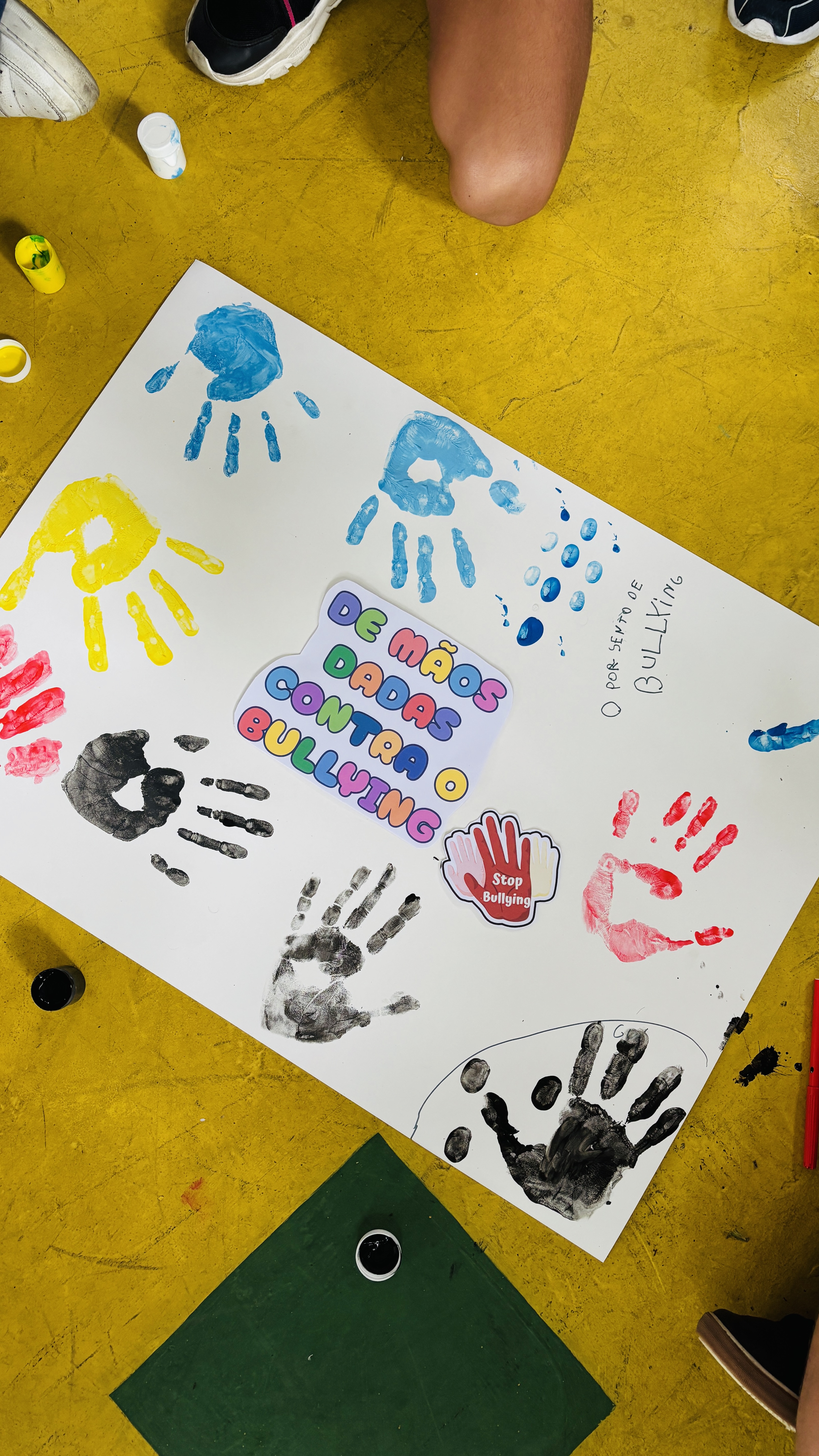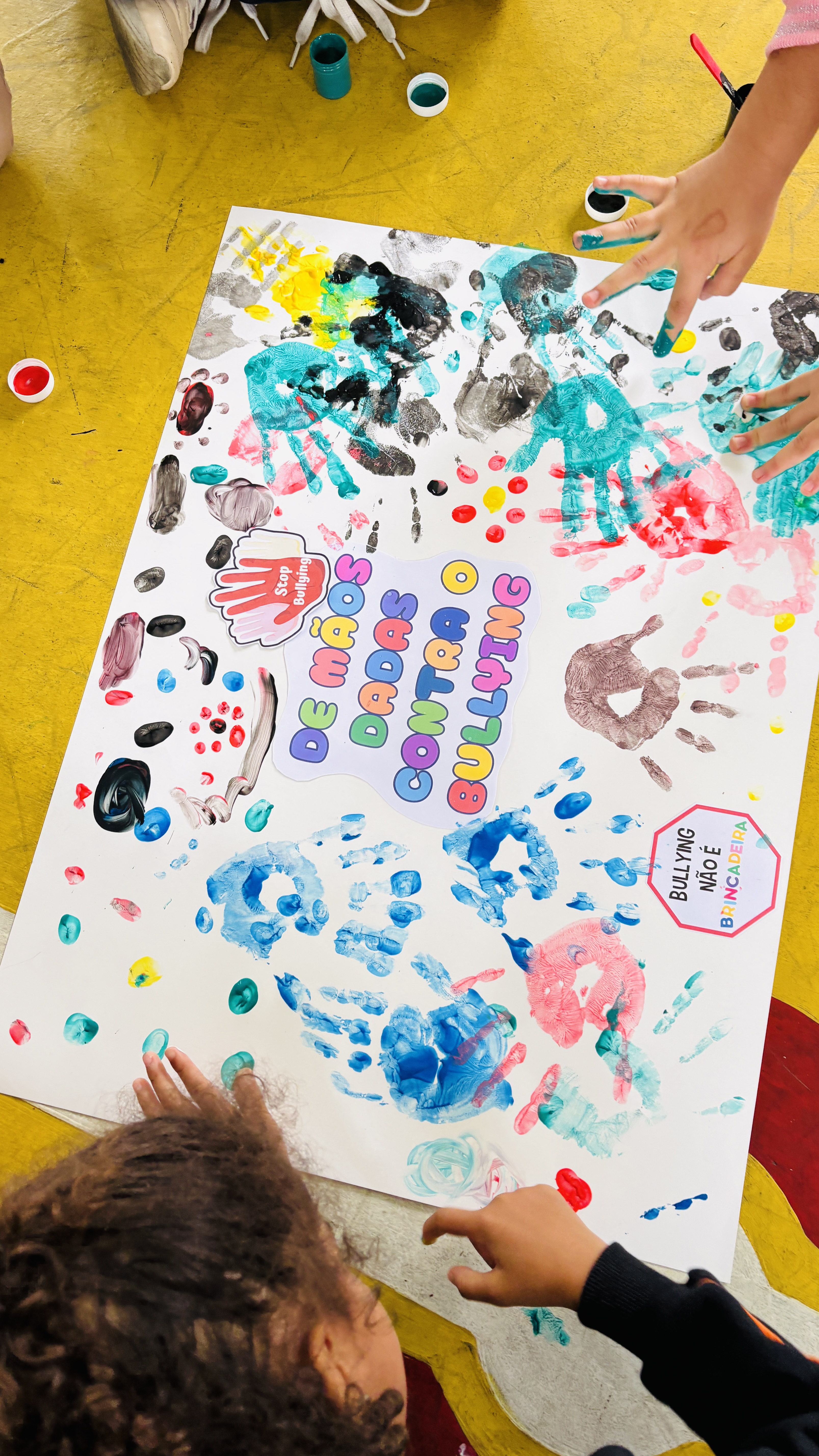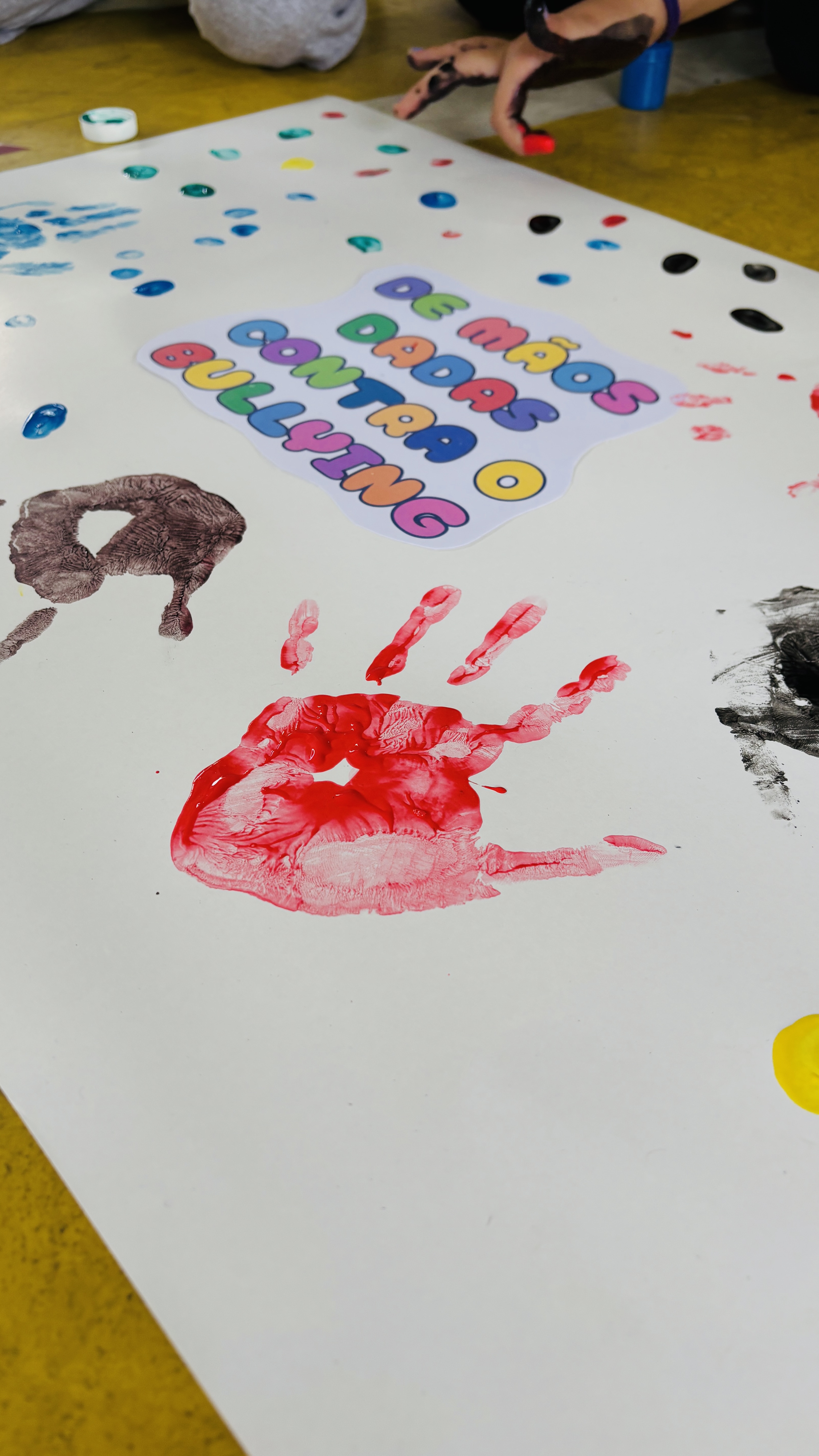 Ao final da atividade, todos colocaram literalmente a mão na massa — ou melhor, na tinta! Com as mãos e dedinhos, criaram cartazes coletivos de conscientização, deixando registrado, em cores e gestos, o compromisso com a empatia e o respeito.