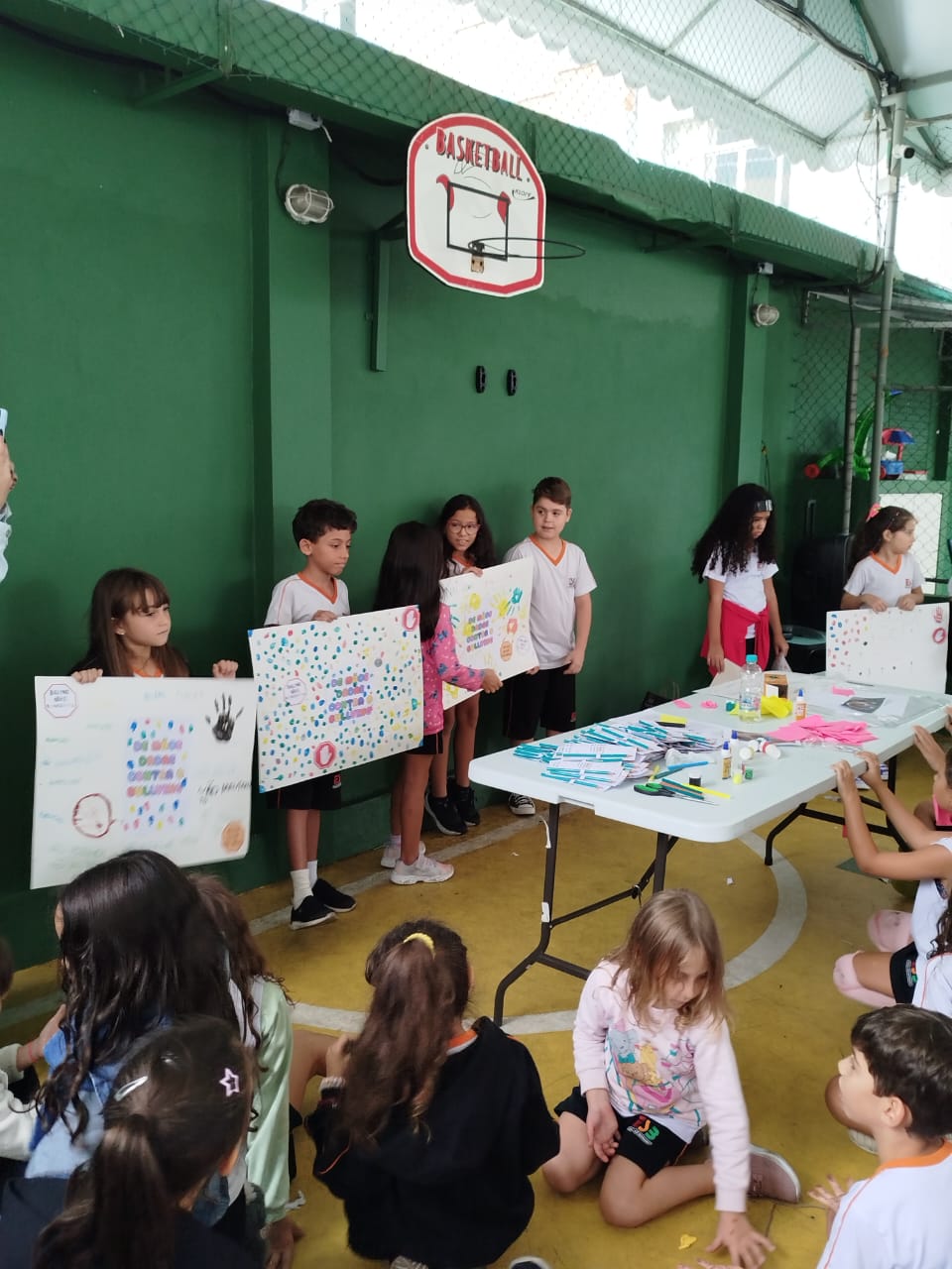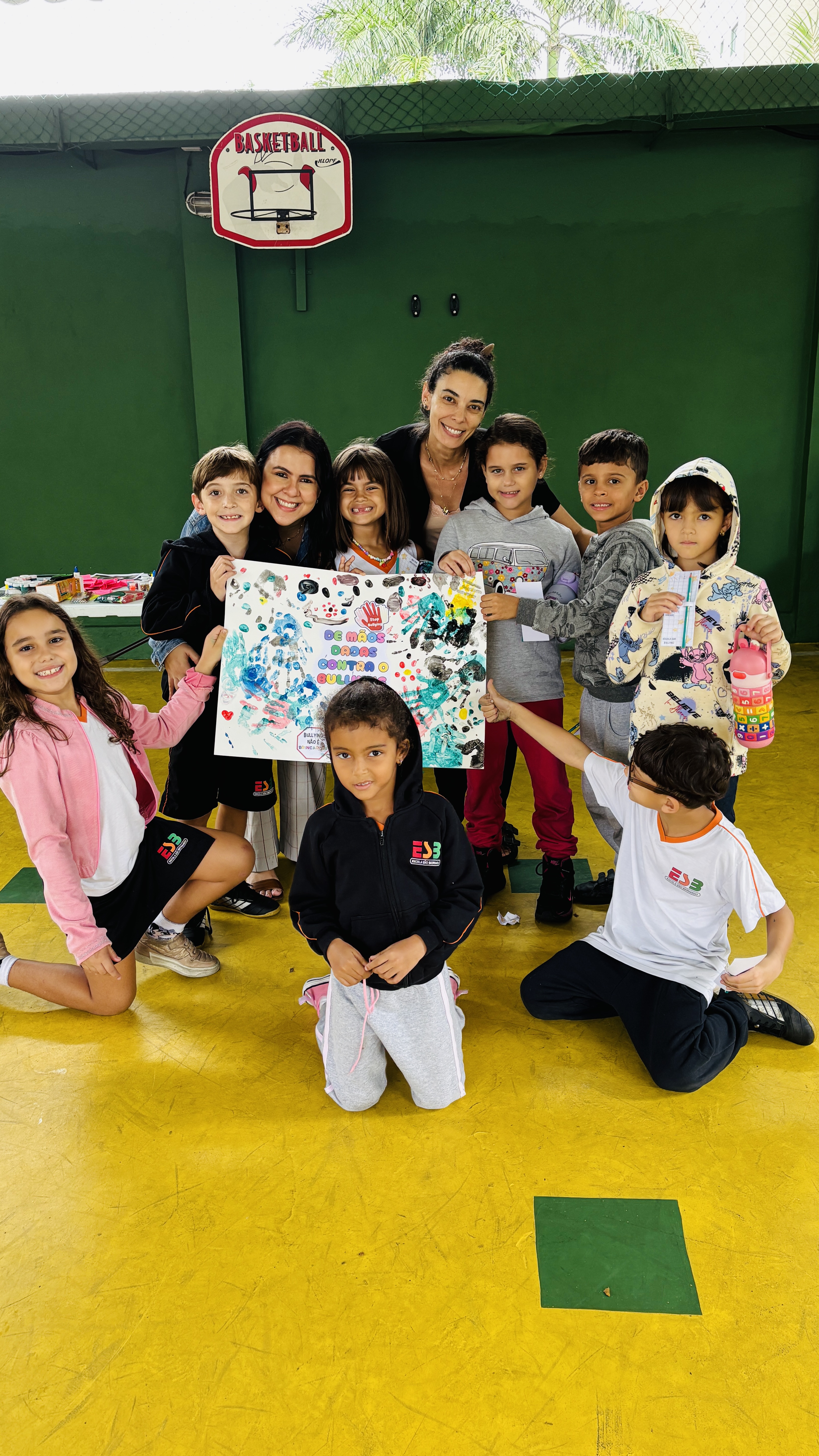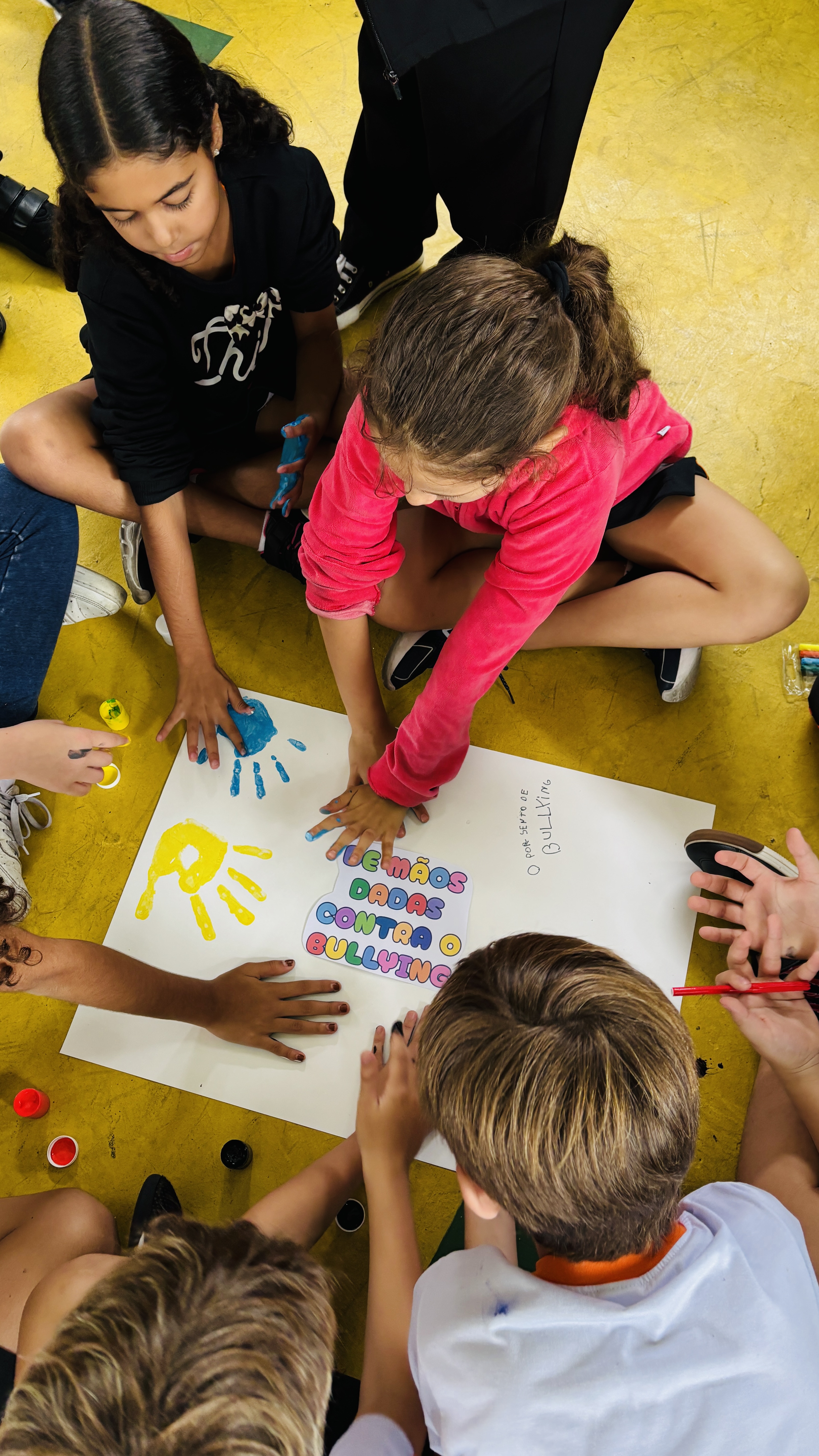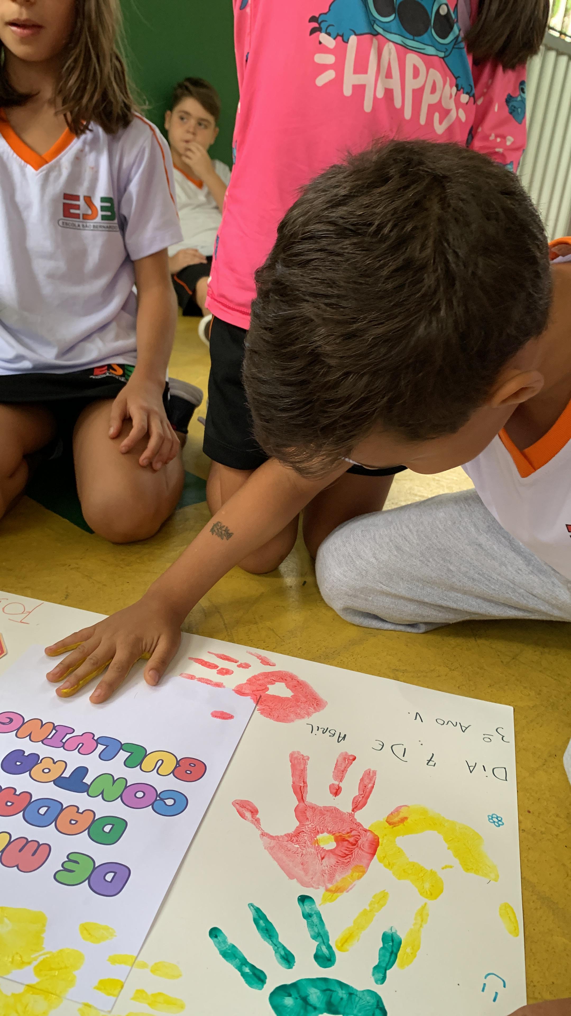 Ao final da atividade, todos colocaram literalmente a mão na massa — ou melhor, na tinta! Com as mãos e dedinhos, criaram cartazes coletivos de conscientização, deixando registrado, em cores e gestos, o compromisso com a empatia e o respeito.