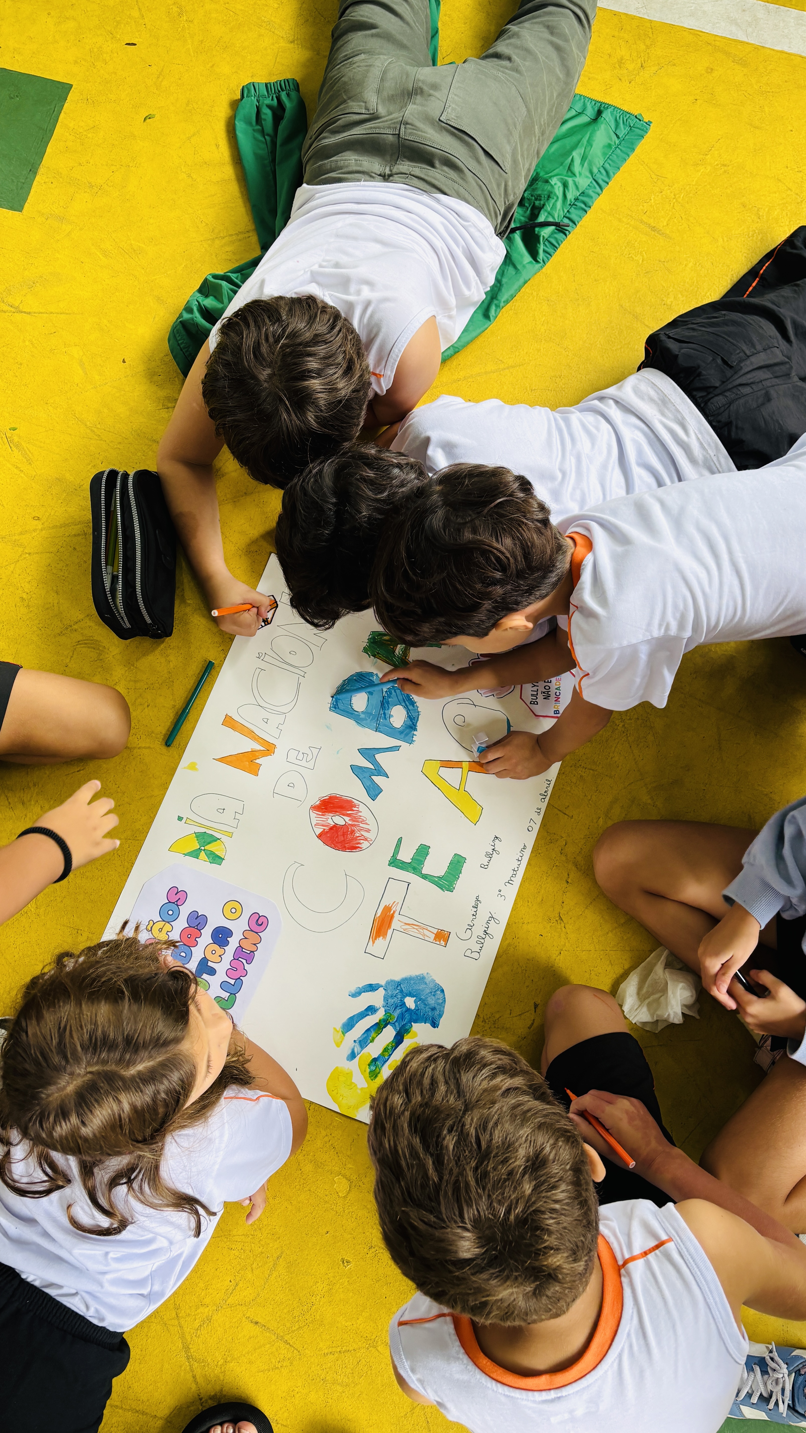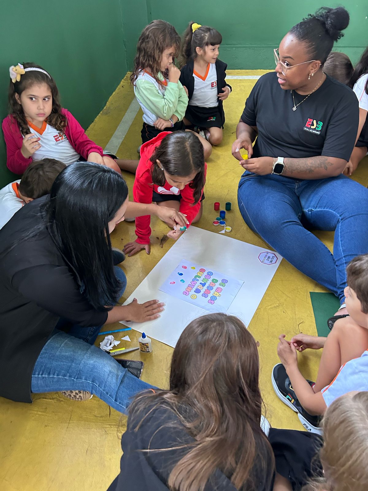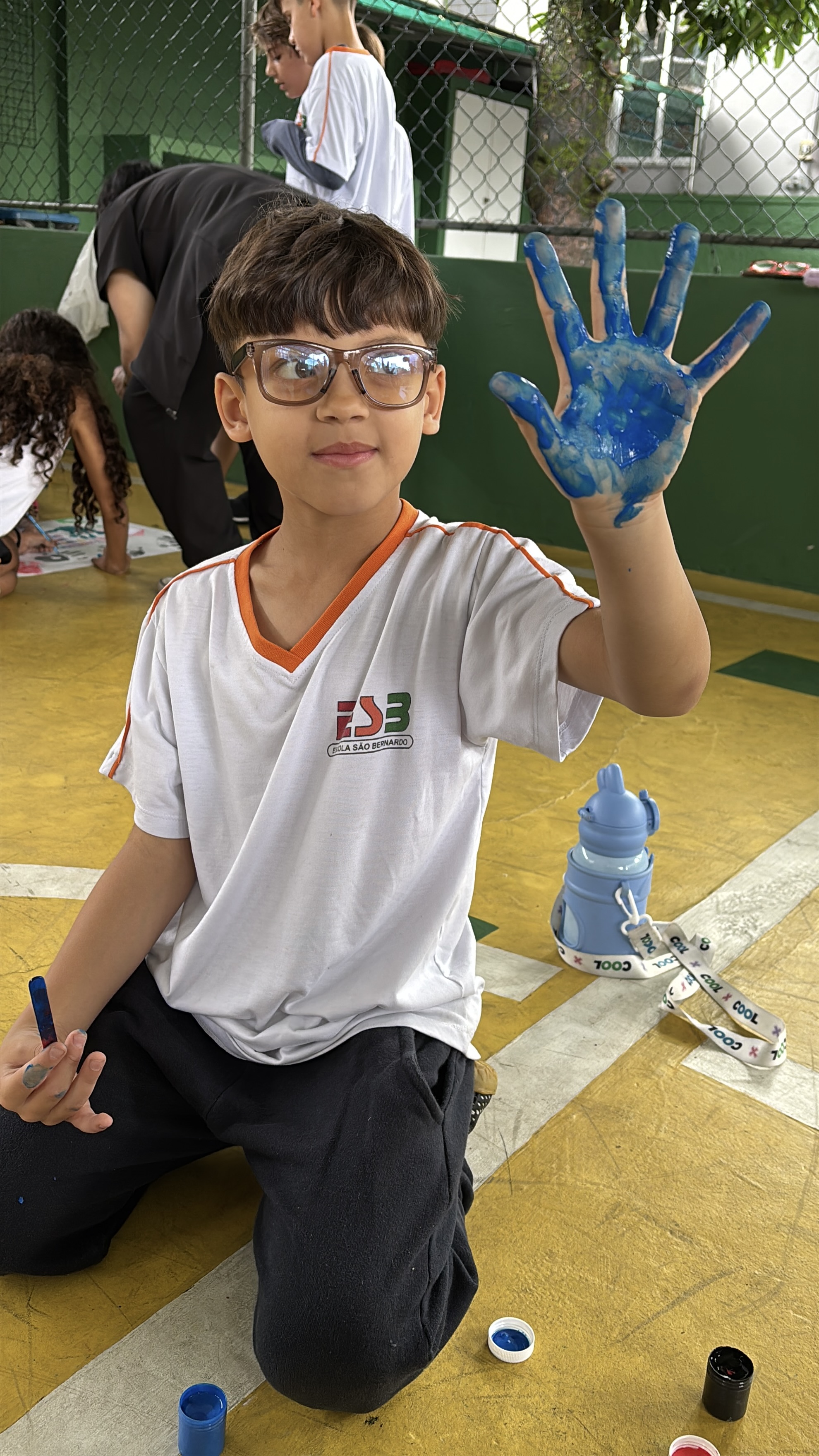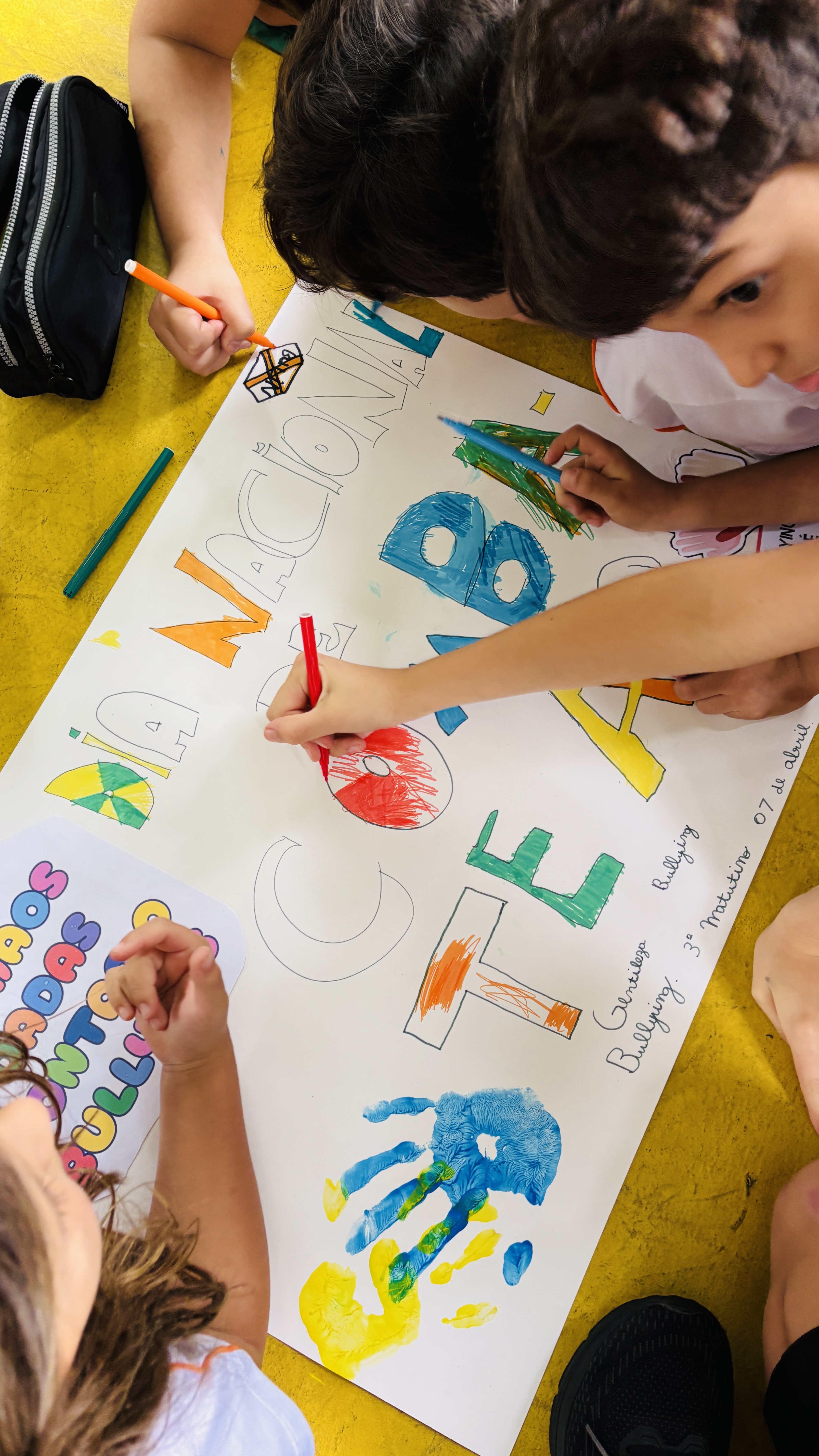 Ao final da atividade, todos colocaram literalmente a mão na massa — ou melhor, na tinta! Com as mãos e dedinhos, criaram cartazes coletivos de conscientização, deixando registrado, em cores e gestos, o compromisso com a empatia e o respeito.