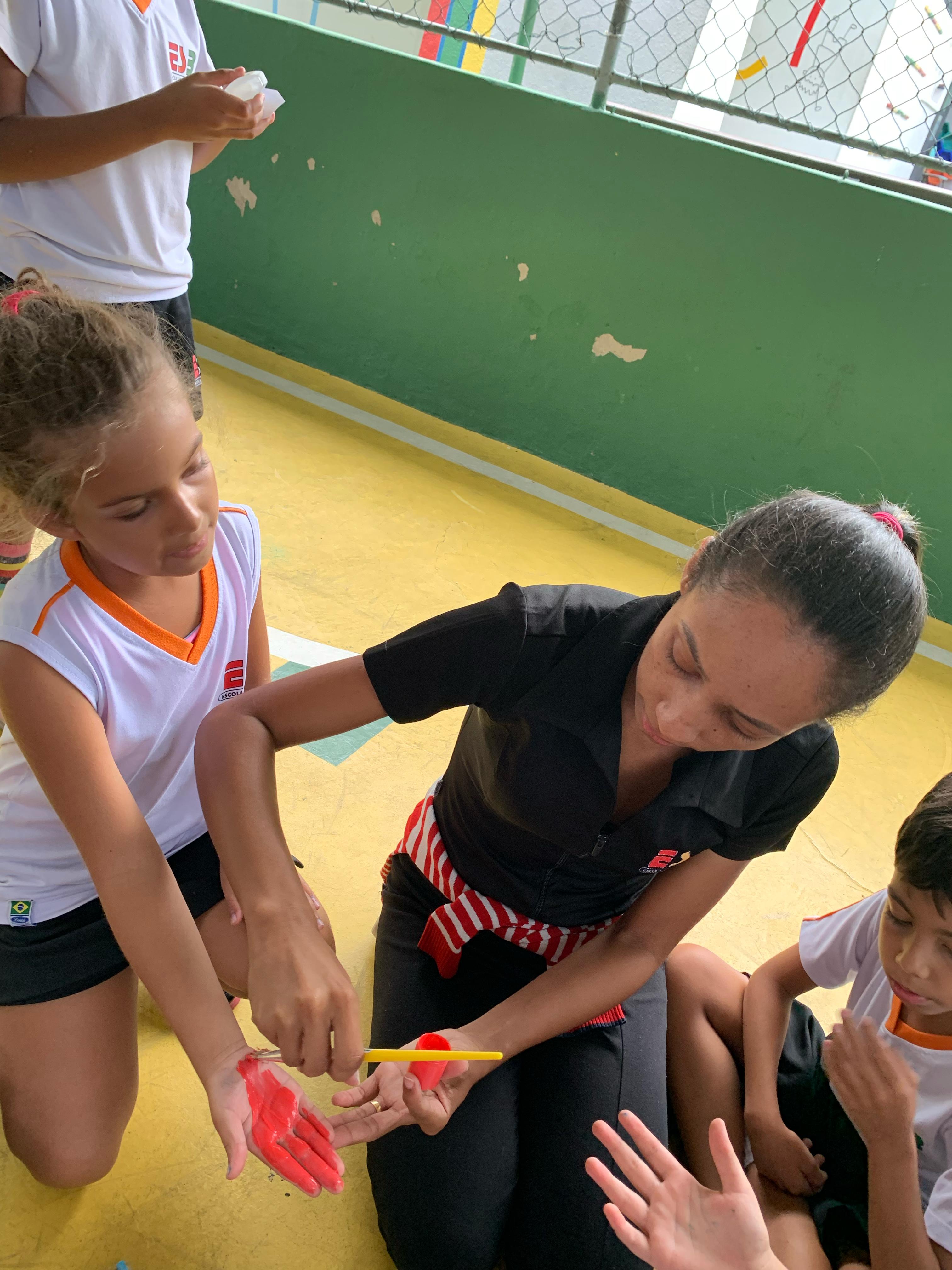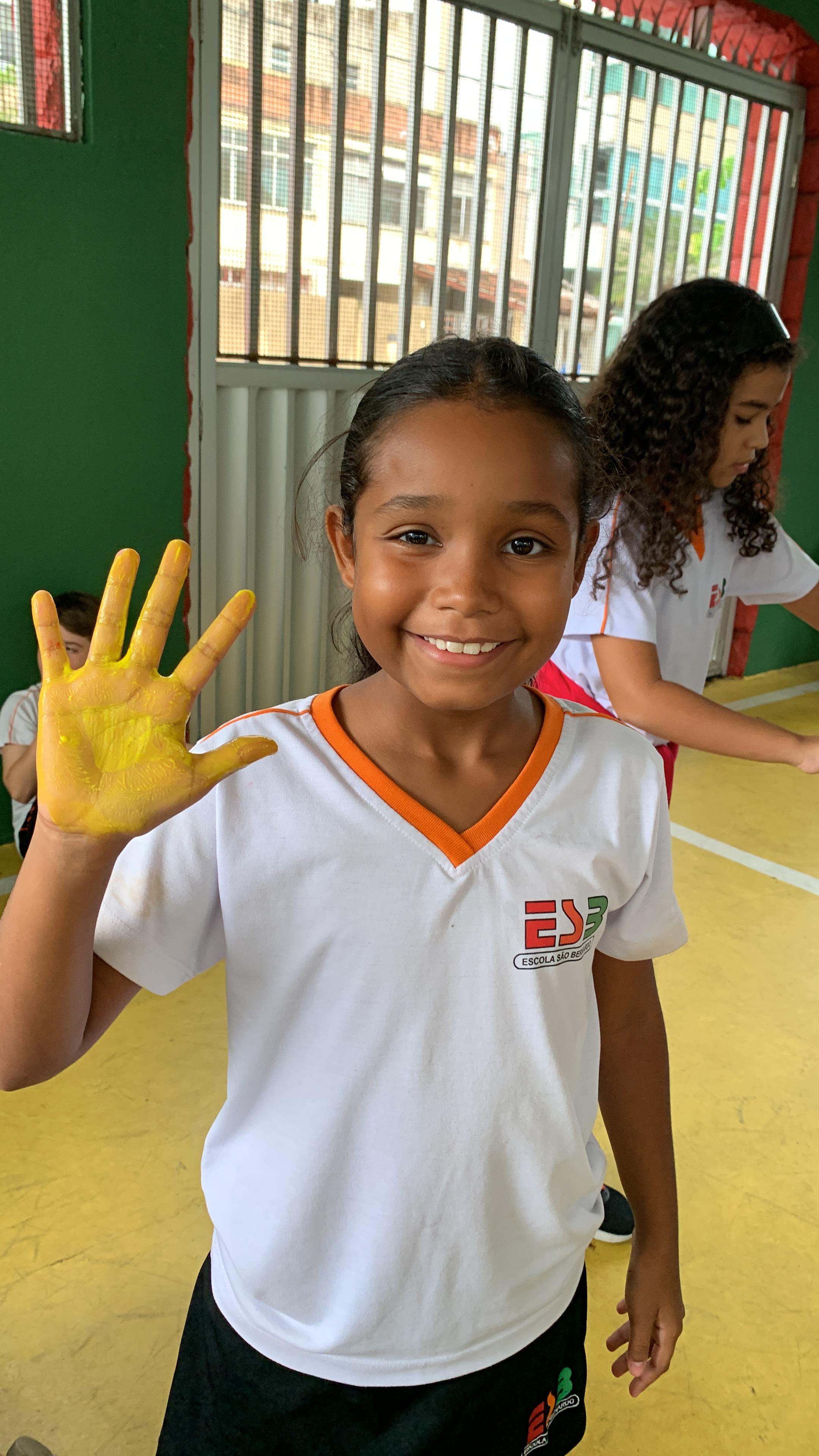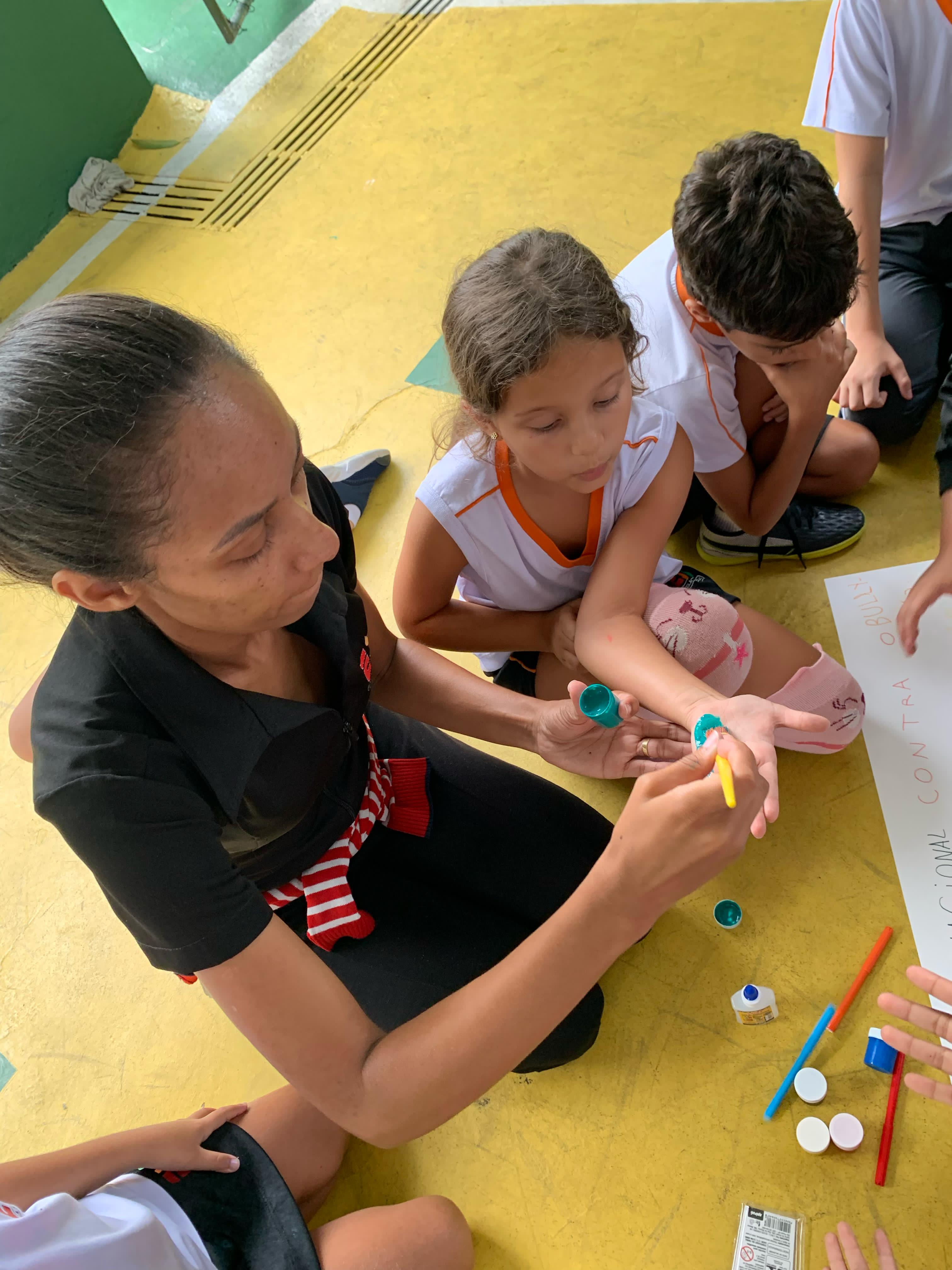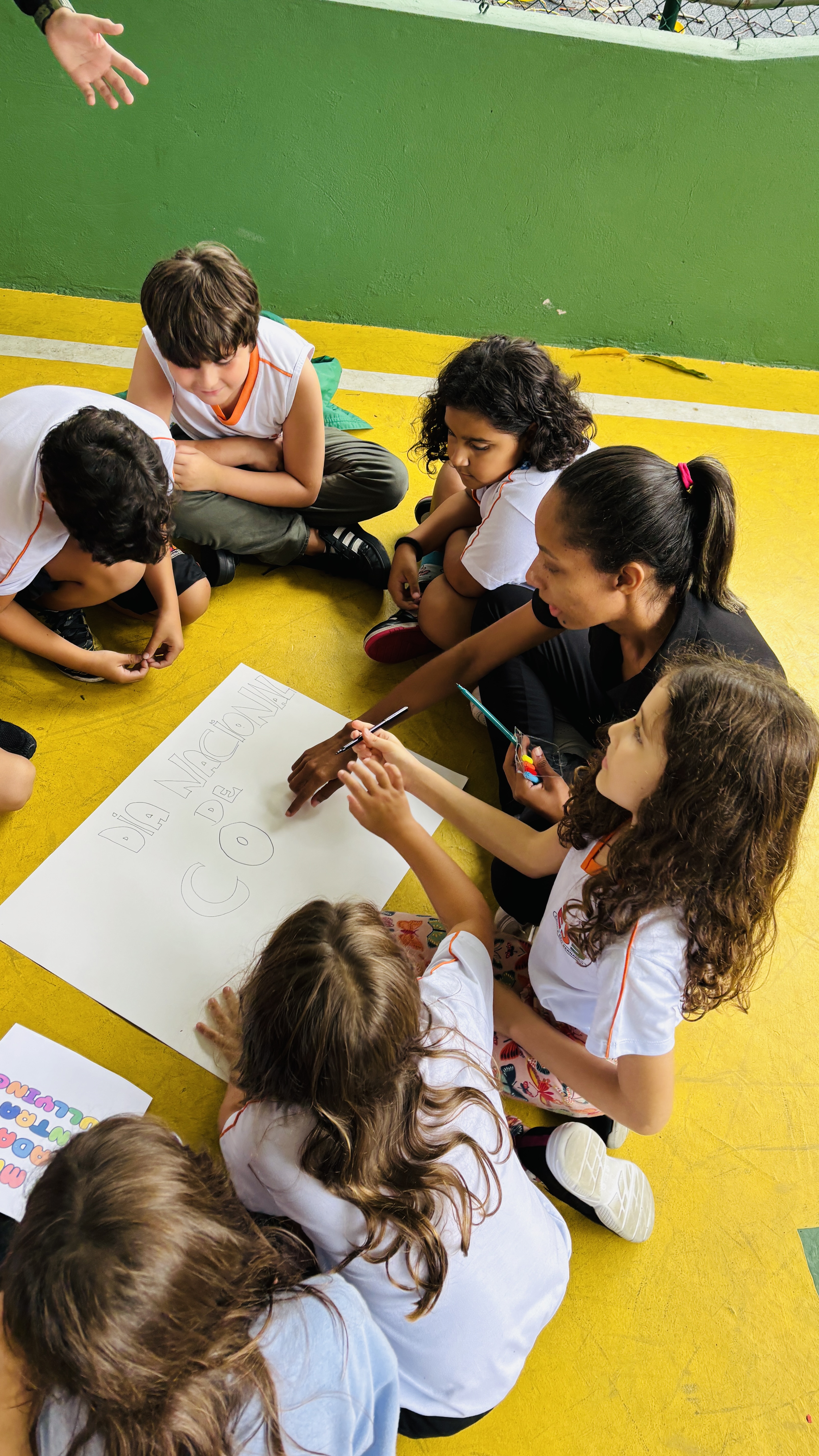 Ao final da atividade, todos colocaram literalmente a mão na massa — ou melhor, na tinta! Com as mãos e dedinhos, criaram cartazes coletivos de conscientização, deixando registrado, em cores e gestos, o compromisso com a empatia e o respeito.