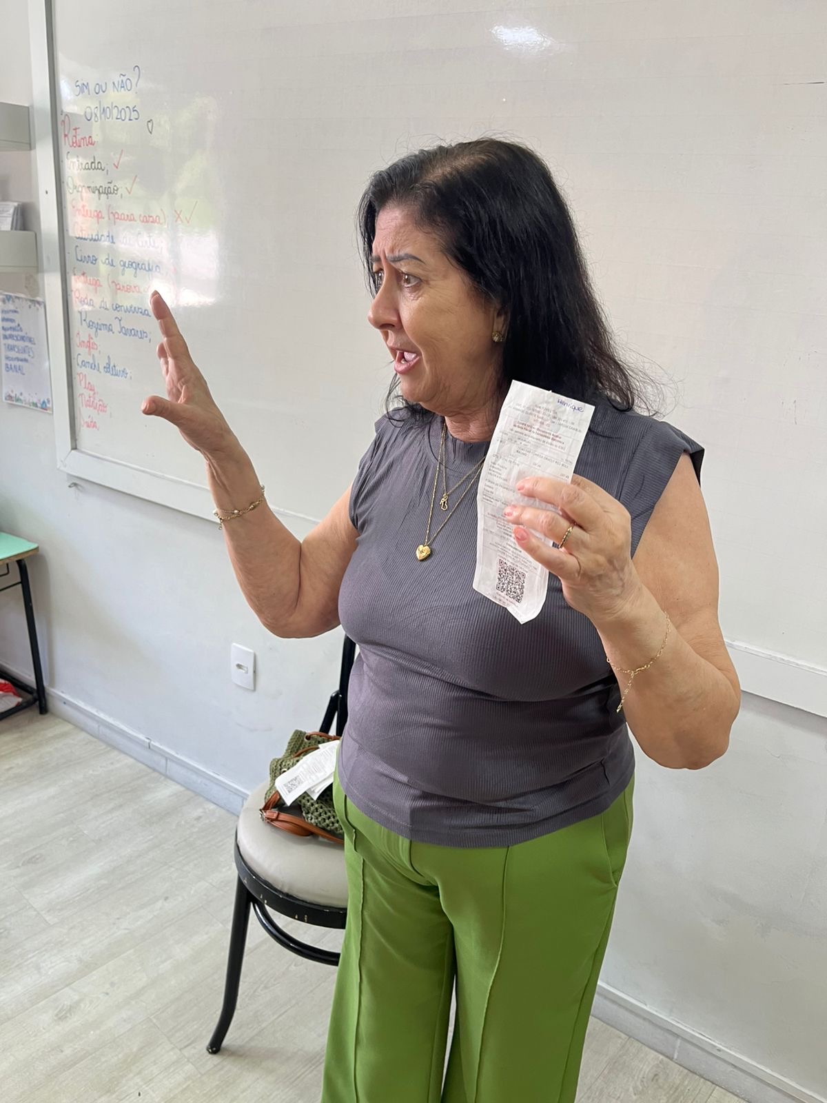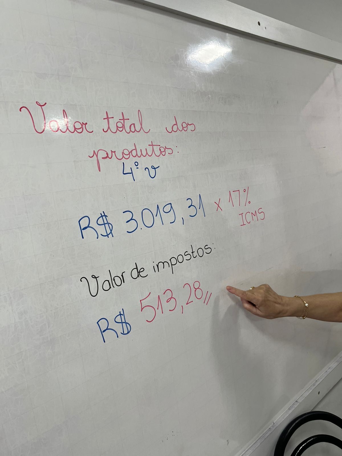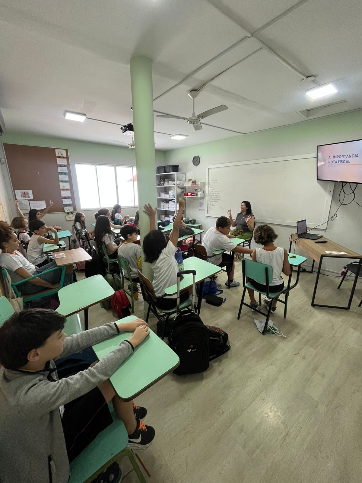 Mas o projeto não parou por aí! No dia seguinte, a turma recebeu a auditora Rozeima Tavares, da Secretaria de Estado da Fazenda (SEFAZ), para uma roda de conversa muito especial. As crianças aprenderam sobre o cupom fiscal, a importância dos impostos, os direitos do consumidor e o conceito de cidadania financeira.